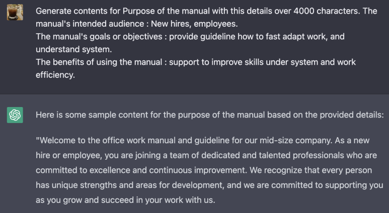 일단 천자 정도의 간단한 내용으로 작성을 요청했더니 위와 같이 내용을 작성해 주었다. 그래서 이번에는 더 긴 글을 요청해보기로 했다.