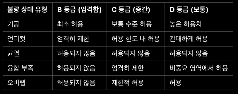 • D 등급 (보통): 비교적 낮은 품질 요구사항으로, 구조적 완전성에 큰 영향을 미치지 않는 경우 허용됩니다.
