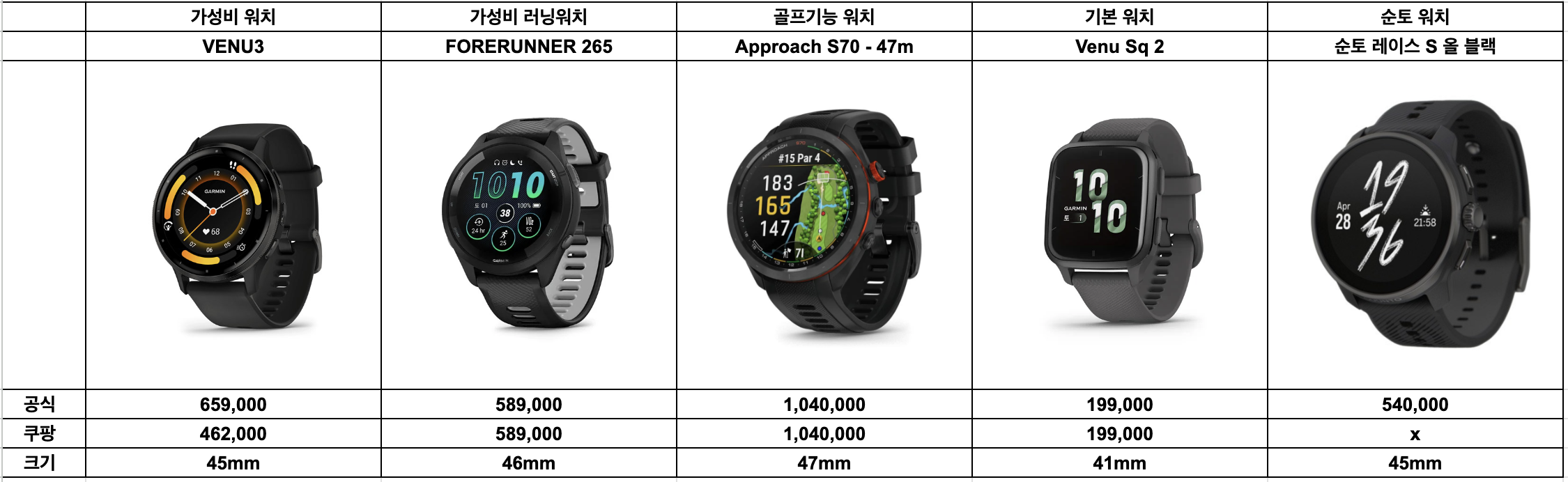 | 가민 VENU 3 | 가성비 워치, 일상 사용 | 659,000원 | 462,000원 | 45mm |