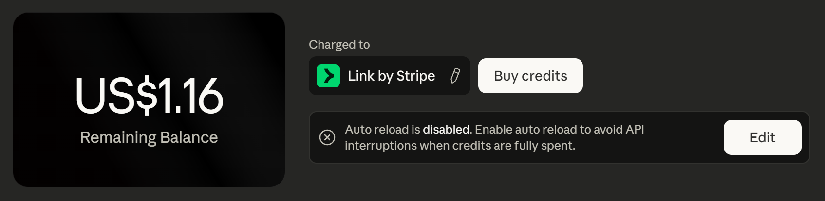 우여곡절 끝에 설치를 마치고, 많은 유저들이 추천하는 Claude(Sonnet, Opus 등) 모델을 연결했다. API 연동을 위해 선불 충전이 필요하다길래 가볍게 5달러를 결제했다.