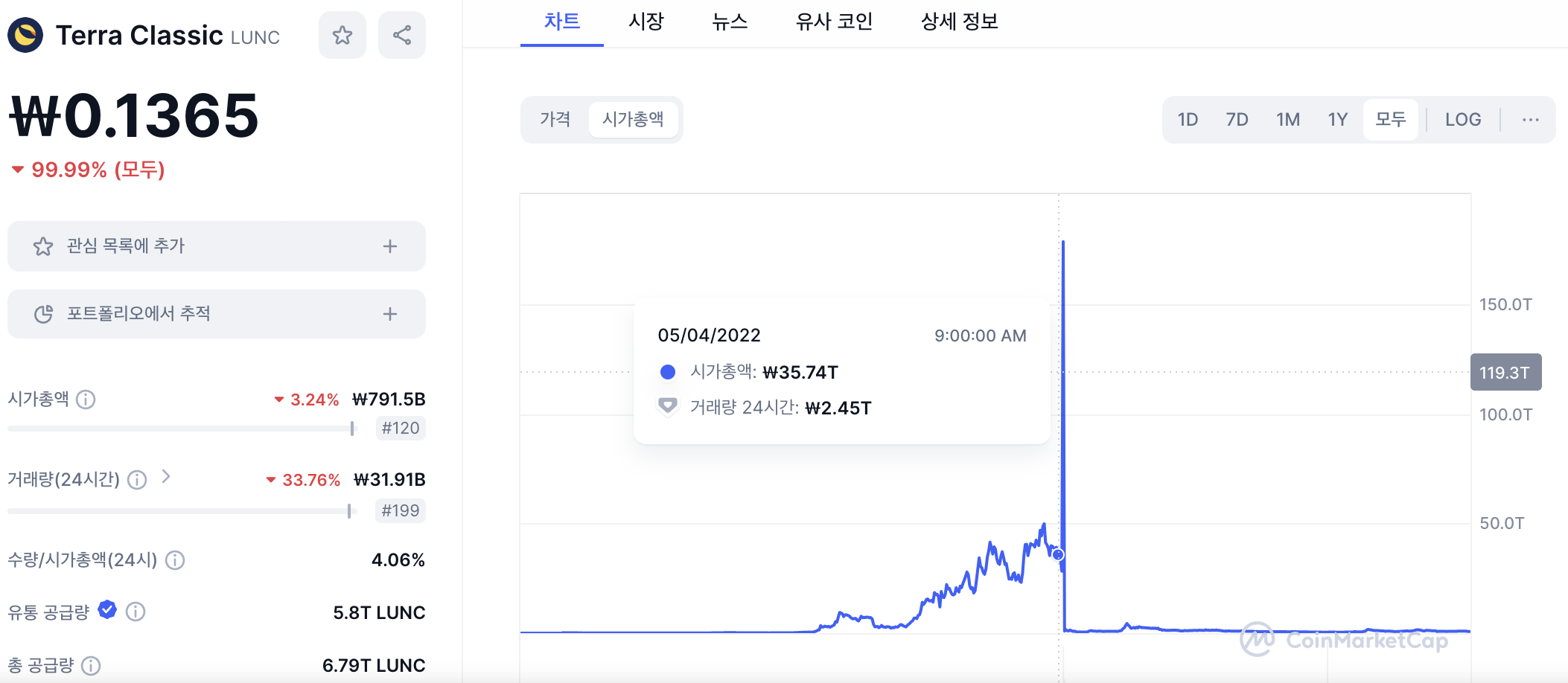 테라 폭락전 약 35조의 시총을 가진 것으로 확인이 되며, 현재 NAVER의 시총이 약 28조인것을 감안하면 실체없는 고작 코인임을 감안하면 어마어마한 가치였던것으로 생각됩니다.
