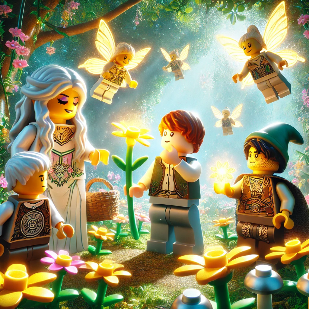 그들은 목소리가 들린 방향으로 고개를 돌렸다. 그곳에는 레고 요정 소녀가 서 있었다. 그녀는 파란 머리에 빛나는 날개를 가지고 있었고, 손에는 작은 마법의 구슬을 들고 있었다.