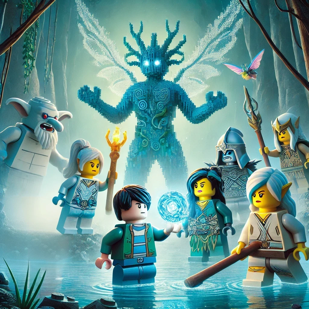 호수의 물이 갑자기 요동치며 거대한 레고 물의 정령이 나타났다. 정령은 거대한 물의 형상을 하고 있었고, 그들의 접근을 막으려는 듯 위협적으로 다가왔다.