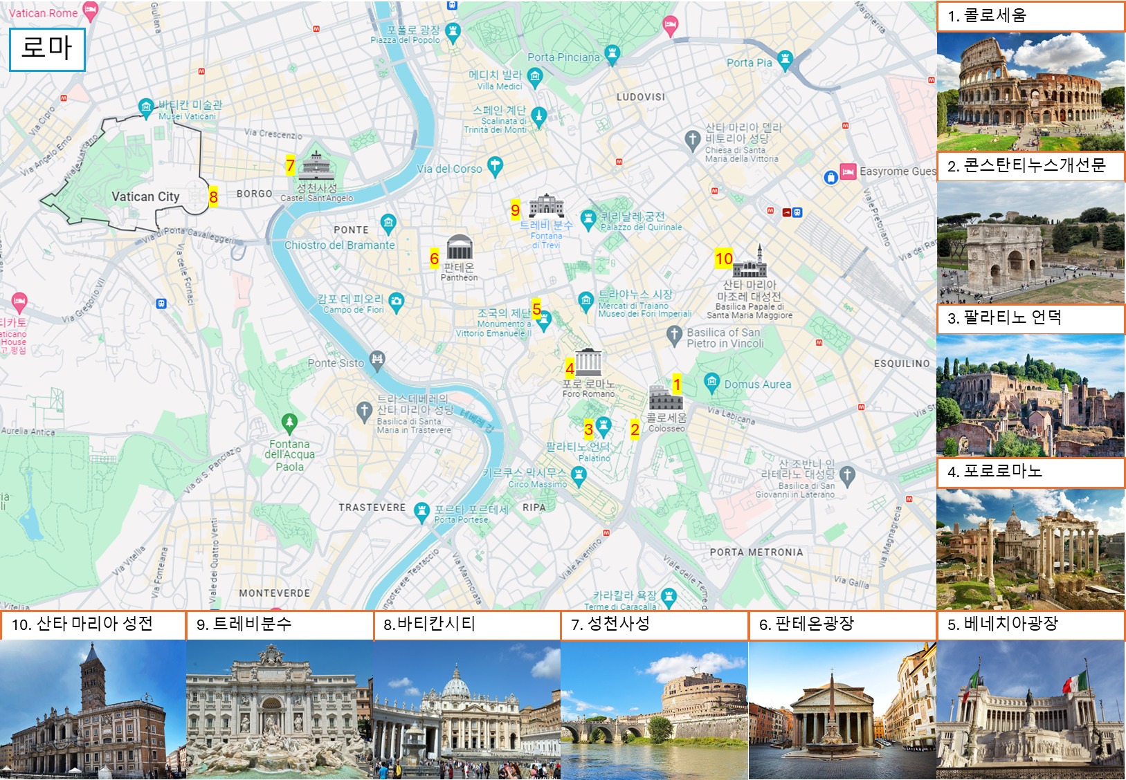 - 관광지 설명: 로마 교황청의 본거지로, 성 베드로 대성당과 시스티나 성당이 있는 곳입니다.